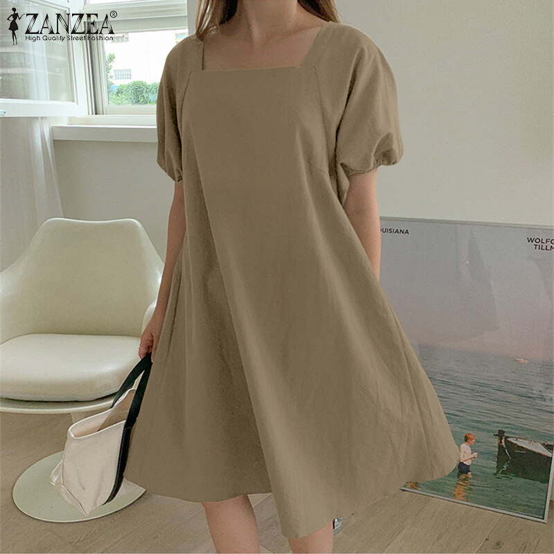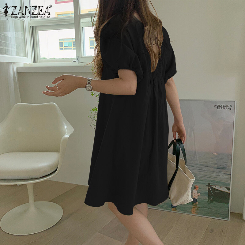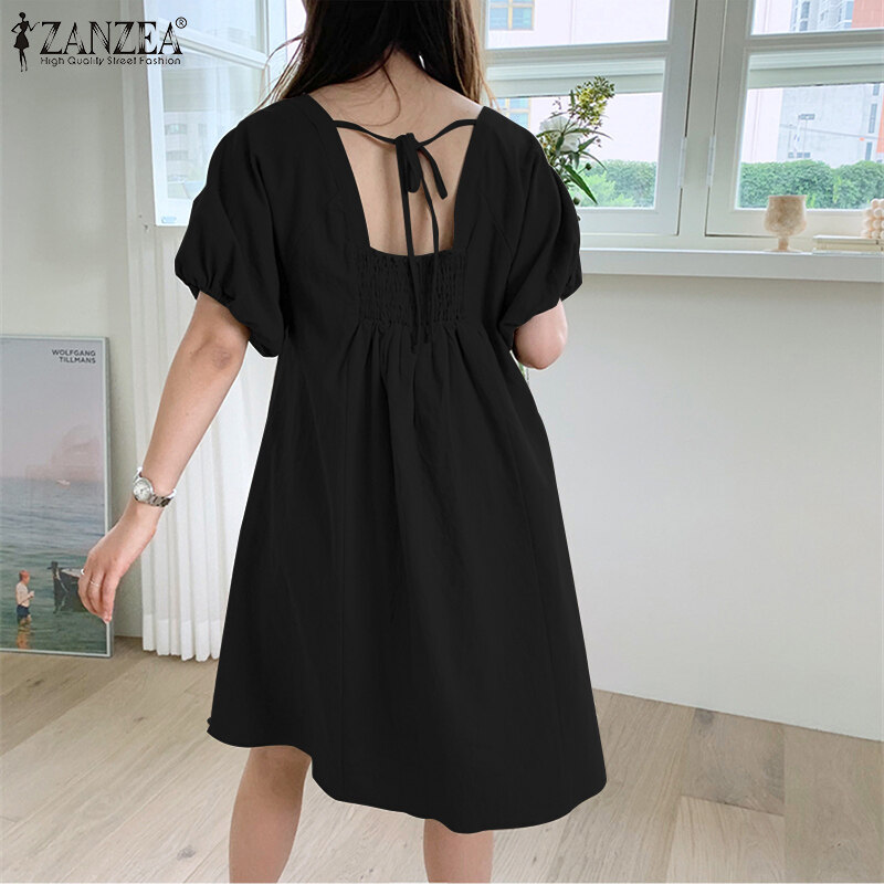 ZANZEA Korean Style Women Elastic Cuff Mini Dress Backless Tie Summer Solid Dress