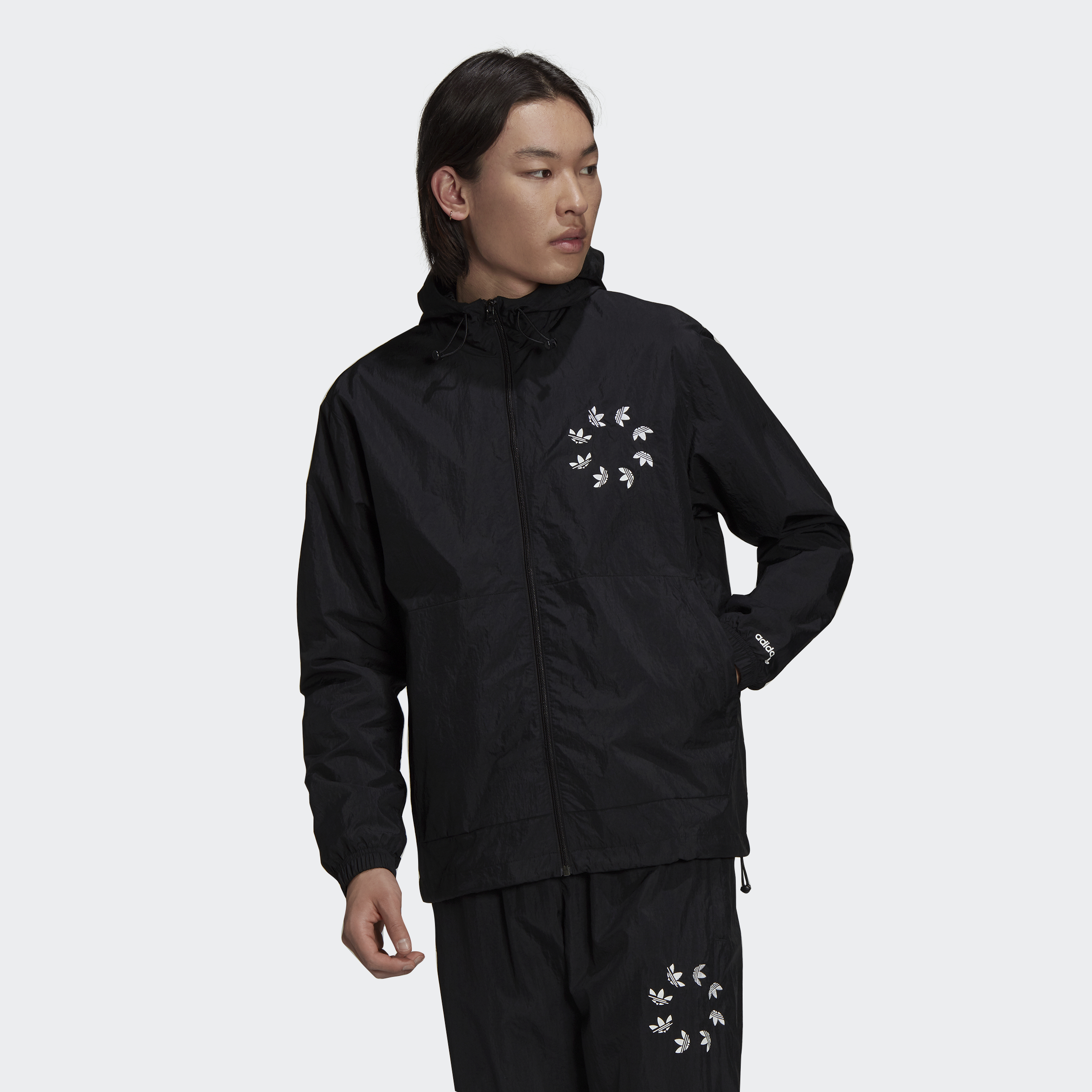 A little wind won't slow your roll. Not when you're layered up in the lightweight fabric and authentic style of this adidas windbreaker. Zip in and step out flashing a swirl of Trefoils. A nod to your creative spirit. Adjustable details help keep out blustery air. This product is made with Primegreen, a series of high-performance recycled materials.