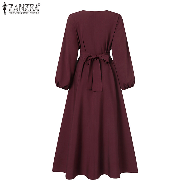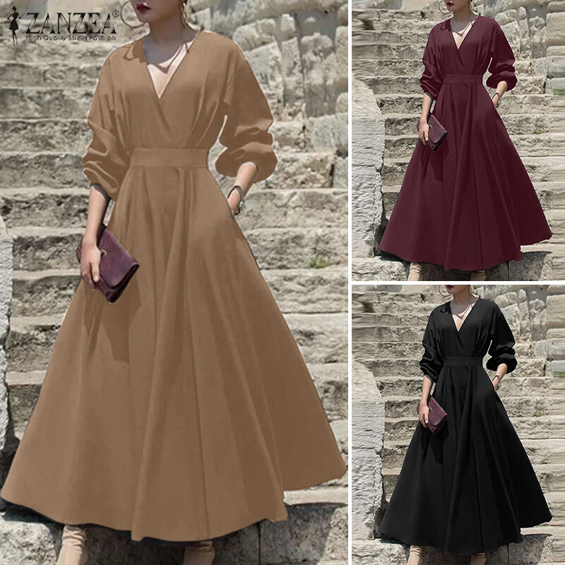 ZANZEA Womens Puff Long Sleeve V Neck Plain Fashion Party Evening Swing Maxi Dress #11