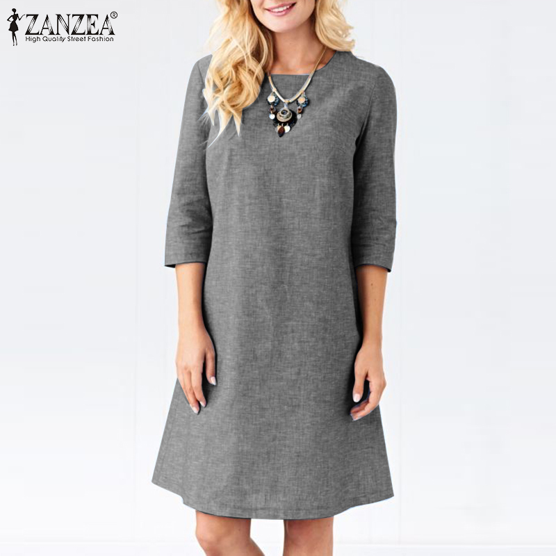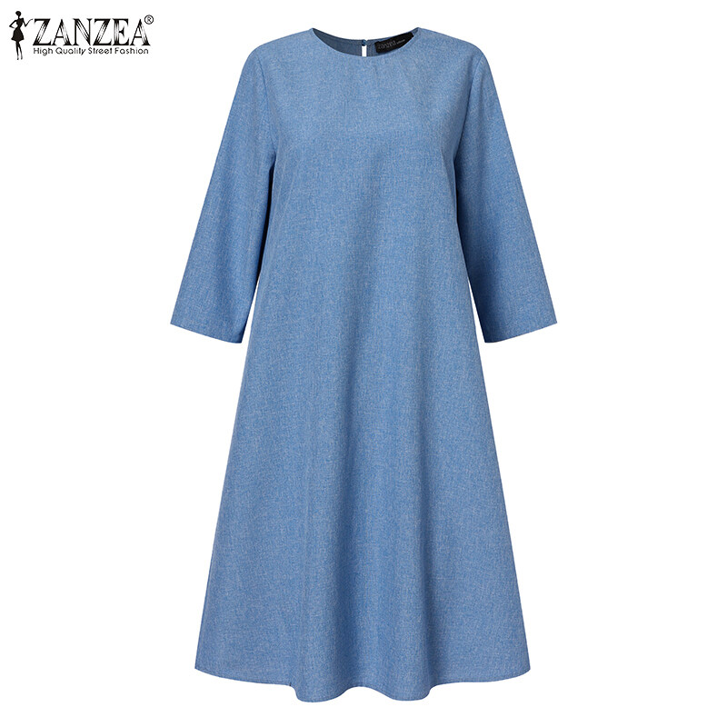 ZANZEA Women Vintage Simple 3/4 Sleeve Midi Dresses Loose Solid Round Neck Sundress #15