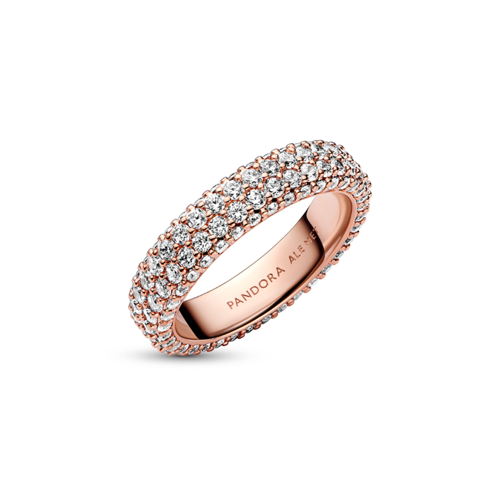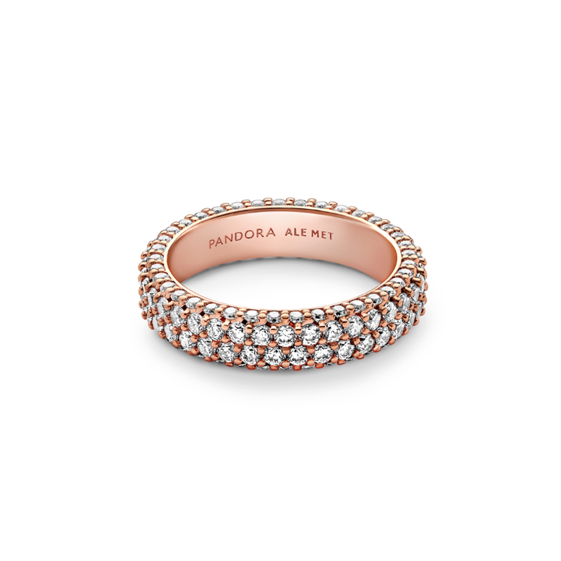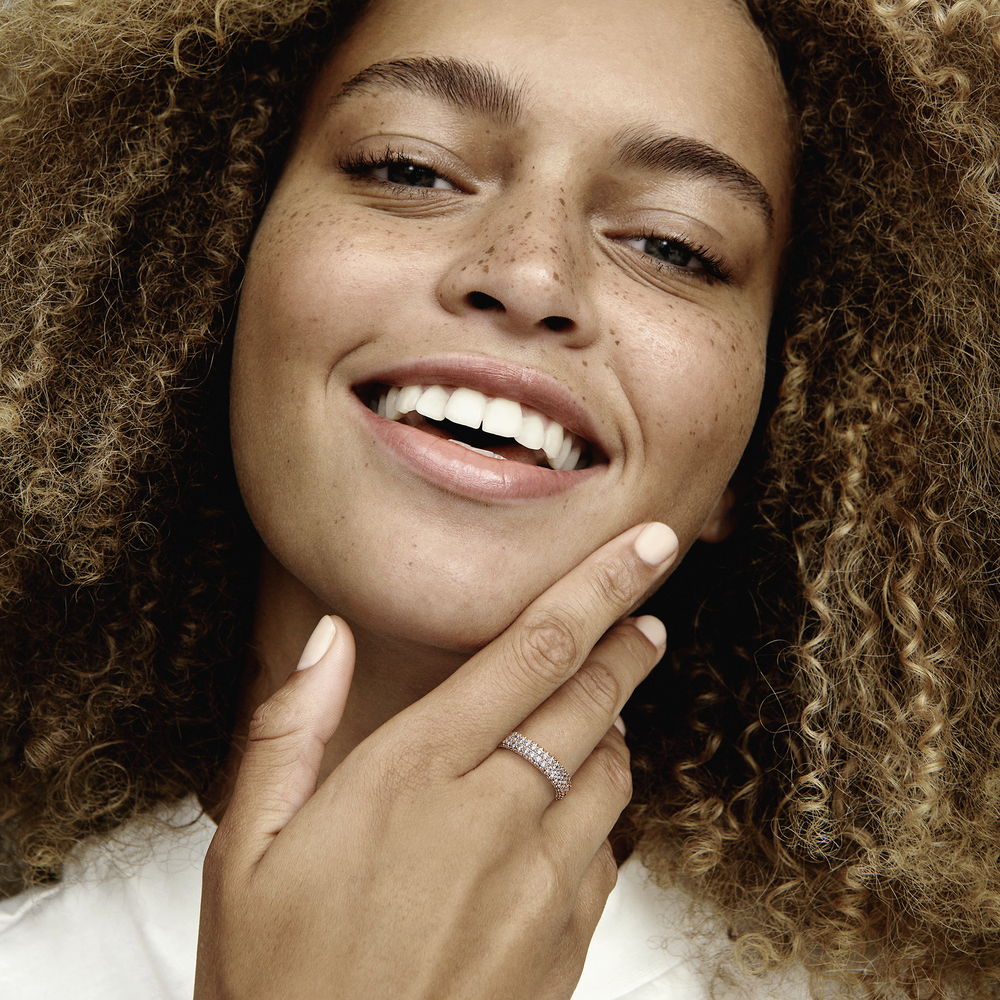 Maximise your sparkle with our Pandora Timeless Pavé Double-row Ring. With warm 14k rose gold plating, this hand-finished ring features two rows of clear cubic zirconia around the centre and one row facing outwards around each side, creating a slightly rounded square profile that sparkles from every angle. Wear it on its own or stacked with other Timeless Pavé rings to create as bold of a look as you want.